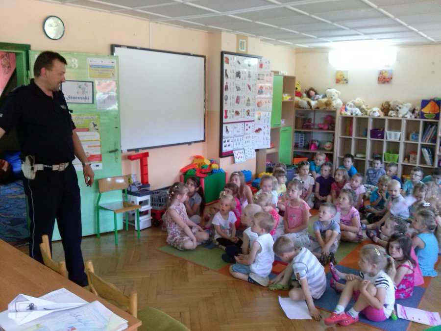 Policjanci z kłobuckiego wydziału ruchu drogowego odwiedzili dzieci z przedszkola w Parzymiechach. Mundurowi tłumaczyli maluchom, co robić, aby być bezpiecznym podczas zbliżających się wakacji. Przedszkolaki wysłuchały cennych rad stróżów prawa, a w dowód wdzięczności za wizytę w przedszkolu wręczyły im piękne rysunki.