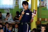 Tradycyjnie wrzesień to miesiąc licznych spotkań policjantów z uczniami. Mundurowi z kłobuckiej policji odwiedzili dzisiaj najmłodsze dzieci ze Szkoły Podstawowej nr 2 w Kłobucku. Maluchy miały okazję z bliska zobaczyć policyjny lizak, kajdanki, broń czy gaz, dowiedzieć się, do czego służą te przedmioty i kiedy stróże prawa mogą ich użyć. Dzieci wysłuchały też cennych wskazówek, jak należy się zachowywać, aby nigdy nie wejść w konflikt z prawem. Najważniejszym punktem spotkania była jednak prelekcja na temat bezpieczeństwa na drodze. Policjant uczył dzieci co należy robić, aby zawsze bezpiecznie dotrzeć do szkoły i wrócić po zajęciach do domu. Podczas pogadanki nie zabrakło też nawiązania do trwającej w naszym województwie kampanii „Nie reagujesz – akceptujesz”, a każde dziecko otrzymało na pamiątkę plan lekcji z logo tej kampanii.