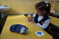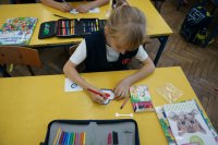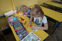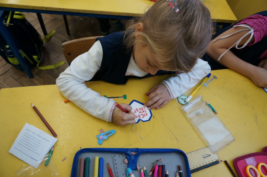 Pierwszoklasiści kolorują serduszka dla swoich bliskich