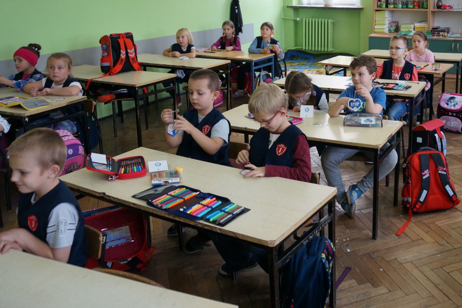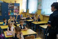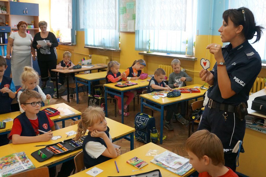 Uczniów pierwszych klas Szkoły Podstawowej nr 1 w Kłobucku odwiedziła wczoraj policjantka z licealistkami należącymi do Młodzieżowej Służby Ruchu Drogowego. Dzieci uczyły się bezpiecznych zachowań w domu, szkole i na drodze, a także kolorowały otrzymane od policjantki serduszka kampanii „Kochasz? Powiedz STOP Wariatom Drogowym”.