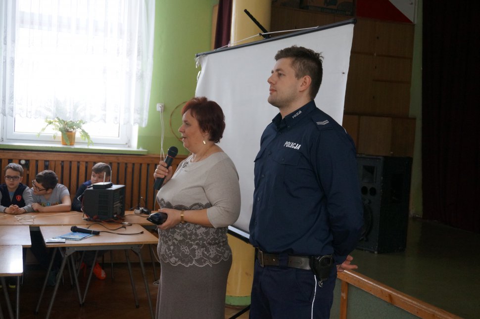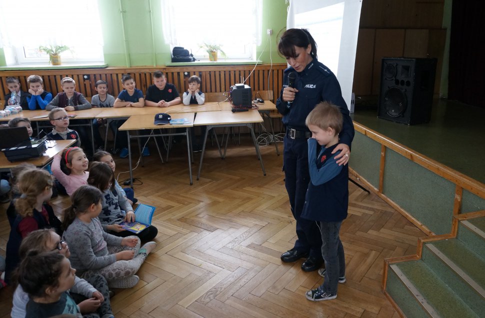 Wczorajsze spotkanie podzielone było na dwie części. W pierwszej z nich udział wzięły dzieci z klas 1-3. Maluchy wysłuchały pogadanki o pracy policjantów, a także o tym, jak być bezpiecznym, gdy dorosłych nie ma w domu, którą stroną drogi należy chodzić, gdy nie ma chodnika, a także jak bezpiecznie przechodzić przez przejście dla pieszych. Uczniowie z klas 4-6 dowiedzieli się natomiast, jakie zachowania są niezgodne z prawem i co im grozi za łamanie obowiązujących przepisów. Przedstawiciel zespołu do spraw nieletnich naszej komendy przedstawił i omówił problem cyberprzemocy. Ponadto policjant wskazał na zagrożenia płynące z nieodpowiedzialnego korzystania z popularnych portali społecznościowych.