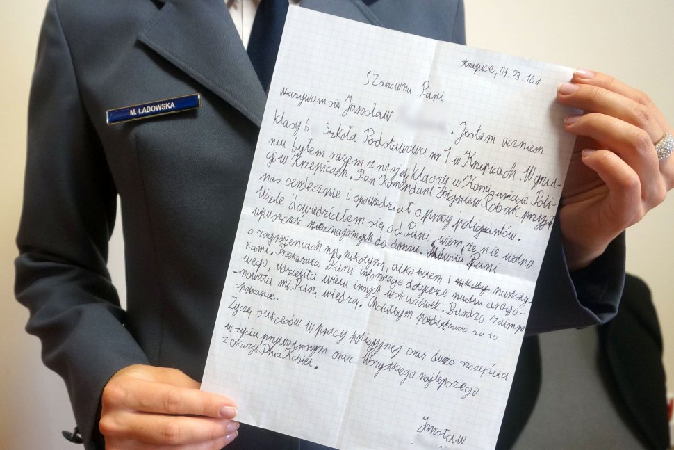 Na początku marca do rzeczniczki z Komendy Powiatowej Policji w Kłobucku wpłynął odręcznie napisany list. Nadawcą był Jarek - uczeń 6 klasy Szkoły Podstawowej nr 1 w Krzepicach. Chłopiec podziękował w nim mundurowym za grudniową wizytę jego klasy w Komisariacie Policji w Krzepicach, która była dla niego bardzo pouczająca. List zawierał też życzenia „(...) sukcesów w pracy policyjnej oraz szczęścia w życiu prywatnym (...)”. Komendant Komisariatu Policji w Krzepicach podinsp. Zbigniew Robak i rzeczniczka kłobuckiej Policji mł. asp. Marta Ladowska postanowili zrobić nadawcy listu niespodziankę i odwiedzić go przed nadchodzącymi Świętami Wielkanocnymi w szkole. Stróże prawa wręczyli Jarkowi upominki, w tym małą maskotkę śląskiej Policji – Sznupka. Chłopiec był bardzo zaskoczony i szczęśliwy, że jego list dotarł na komendę, a on mógł znowu spotkać się z policjantami. Jak zgodnie stwierdzili mundurowi, tak miły gest ze strony ucznia zdarzył im się pierwszy raz, bardzo ich ucieszył i dał motywację do dalszych działań profilaktycznych.