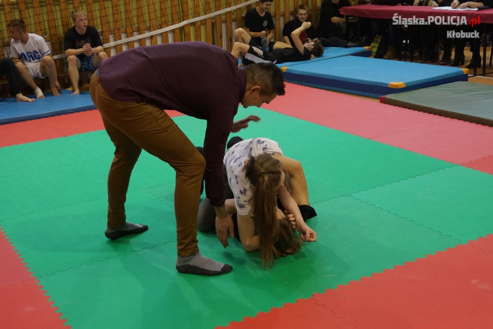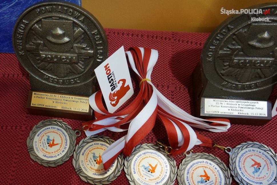 Zawody „otworzyli” szef kłobuckich stróżów prawa mł. insp. Dariusz Atłasik wspólnie z dyrektorem szkoły Pani Anną Nowicką. Do udziału w walkach zgłosiły się uczennice i uczniowie szkoły. W kategorii OPEN mogli natomiast wziąć udział także absolwenci. Grappling w skrócie oznacza walkę na chwyty, gdzie dozwolone są dźwignie, duszenia i obalenia. To jedyna takiego rodzaju impreza w powiecie kłobuckim. Uczniowie klas ogólnopolicyjnych mają możliwość poznawania technik samoobrony na obowiązkowych zajęciach. Pozostali uczniowie szkoły na kłobuckim Zagórzu mają możliwość treningu na zajęciach dodatkowych. Wielu uczęszcza również do klubów sportów walki. Wszyscy mają możliwość zaprezentowania swoich umiejętności właśnie podczas zawodów w Grapplingu. Każdy, kto wziął udział w turnieju, otrzymał upominek, natomiast dla zwycięzców przygotowano statuetki. Nagrody wręczyły pełniąca obowiązki Naczelnika Wydziału Prewencji kłobuckiej komendy podinsp. Izabela Woszczyńska oraz zastępca dyrektora Zespołu Szkół nr 1 w Kłobucku Pani Bożena Trzepizur.