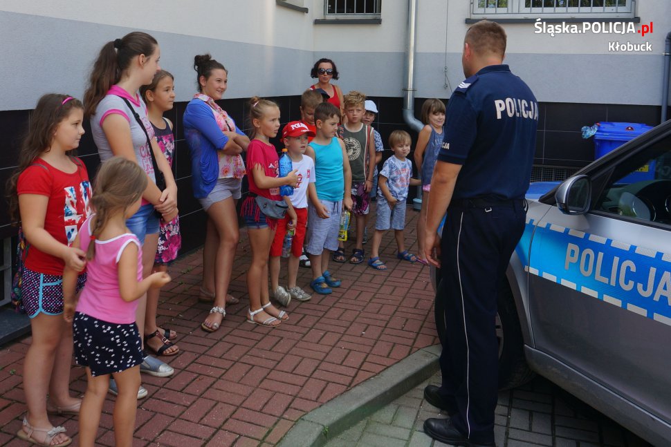 W piątek w ramach działań „Kręci mnie bezpieczeństwo … w wakacje” naszą komendę odwiedziły dzieci spędzające wakacje na zajęciach w kłobuckim MOK-u.. Stróże prawa zaprezentowali sprzęt policyjny wykorzystywany w codziennej służbie, a także przekazywali młodym słuchaczom wiedzę na temat tego jak bezpiecznie spędzić wakacje. Omówiono zasady poruszania się w ruchu drogowym oraz zagrożenia wynikające z niewłaściwego korzystania z Internetu. Szczególną uwagę zwrócono na zasady bezpiecznego zachowania w rejonie zbiorników wodnych i kąpielisk. Wszyscy uczestnicy spotkania otrzymali odblaskowe opaski na rękę.