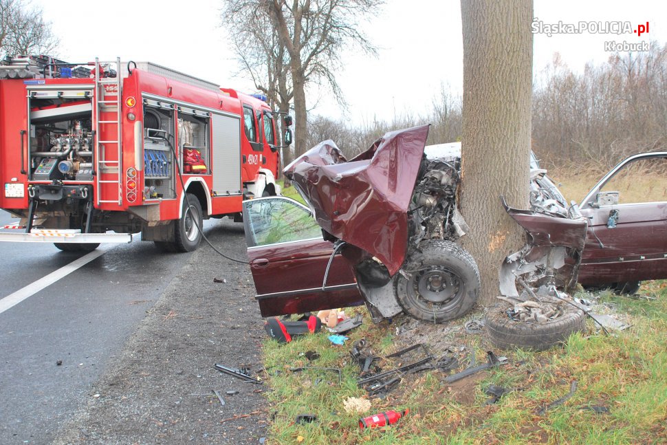 Wypadek w Kłobucku, 33-letni kierowca BMW uderzył w drzewo