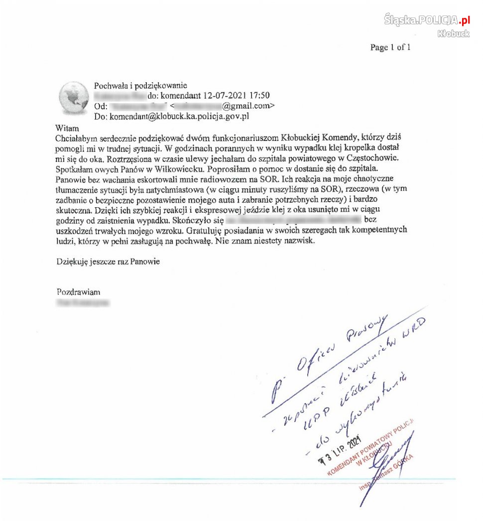 Do Komendy Powiatowej Policji w Kłobucku wpłynęło podziękowanie kobiety, która w związku z urazem oka wymagała szybkiej pomocy lekarskiej. W miniony poniedziałek 11 lipca kobieta nie mogąc samodzielnie prowadzić swojego samochodu, zatrzymała się, czym zwróciła uwagę mundurowych z kłobuckiej drogówki. Gdy policjanci dowiedzieli się, co się stało, natychmiast pomogli kobiecie i eskortowali ją do częstochowskiego szpitala, gdzie na czas otrzymała niezbędną pomoc.