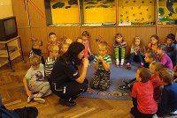 Funkcjonariusze z Komendy Powiatowej Policji w Kłobucku odwiedzili dzisiaj najmłodszych uczniów ze szkół w Łobodnie i Mokrej. Dzieci poznały zasady prawidłowego poruszania się po drodze i przechodzenia przez przejścia dla pieszych. Policjanci uświadamiali uczniom, jak ważne jest noszenie odblasków, szczególnie w takich dniach jak dzisiejszy, kiedy widoczność jest znacznie ograniczona ze względu na złe warunki atmosferyczne. Maskotka Gustawa Pancernika pomogła przypomnieć o konieczności przewożenia dzieci w fotelikach ochronnych z zapiętymi pasami bezpieczeństwa. Najmłodsi poznali też kilka cennych wskazówek, jak należy się zachować, gdy zaatakuje ich agresywny pies albo nieznajoma osoba zaproponuje podwiezienie samochodem do domu. Tradycyjnie uczniowie zapoznani zostali z założeniami kampanii „Nie reagujesz – akceptujesz”.