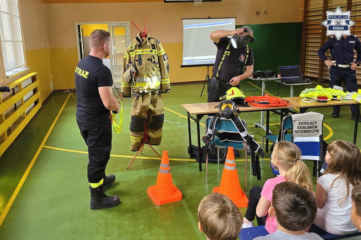 Strażacy pokazali najmłodszym elementy swojego wyposażenia i podkreślili, że odblaski są dla nich niezbędne także podczas działań ratowniczych.