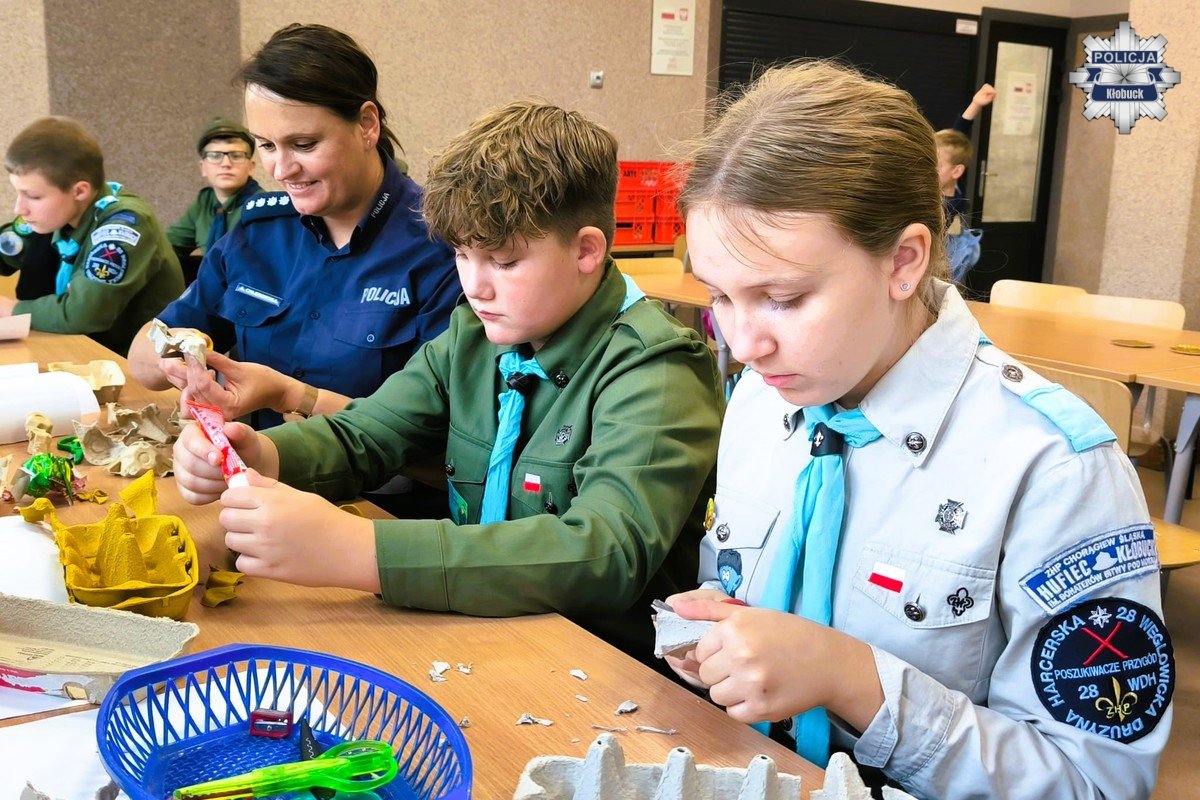 W trakcie zajęć programowych odbywających się w sobotę 11 października, policjantka rozmawiała z zuchami i harcerzami na temat ich szeroko rozumianego bezpieczeństwa, szczególnie bezpieczeństwa w ruchu drogowym.